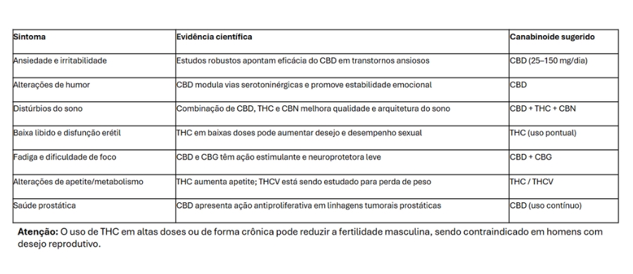 - CBD: ajuda a reduzir a ansiedade, o estresse, a irritabilidade, melhora o foco, promove relaxamento e pode ter efeito protetor sobre a próstata;